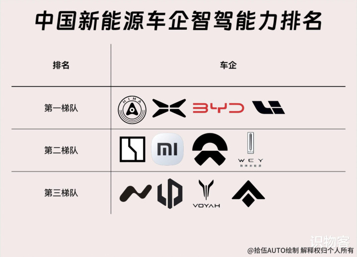 在过去的一年多里,由于新能源汽车行业已经悄然进入到了高阶智驾阶段,不少车企在宣传自己的智驾系统时,往往都喜欢喊上一句:我们的智驾妥妥的智驾第一梯队! 但是「第一梯队」这词既然存在,那理论上就应该有所谓的「第二梯队」、「第三梯队」,但似乎没有一家愿意承认。那行,今天我就从一个消费者的角度,结合我的体验和认知,给各位做个「中国新能源车企智驾能力个人排名」,希望不会伤害到各位企业,也请大家继续努力,争取在2025年实现自己曾经吹过的智驾目标! 那既然要排名,就一定得有一个标准,我说一下我的标准!在我看来,现在的智驾能力其实可以从三点去衡量: 1.是否已经开通全国范围内的高速、城市智驾领航辅助(部分城市不算); 2.是否已经支持全国无图(高精地图不算); 3.是否已经具备并支持了端到端模型。 而至于是纯视觉,还是高精度雷达,这只能算是智驾发展方向的选择,不能作为衡量智驾能力标准。所以我选择用这三个点去衡量各车企的智驾能力,应该没什么大毛病吧? 那第一梯队有谁?这里我给出的鸿蒙智行(乾坤智驾ADS 3.0)、小鹏(XNGP)、比亚迪(天神之眼)、理想(AD MAX)、智己(IM AD)。 首先是鸿蒙智行以及小鹏汽车,这两家应该说是毋庸置疑的,尤其是鸿蒙智行在华为乾坤智驾的加持下,应该说是最早实现这三个标准的。小鹏的XNGP有着坚实的基础,只是全国都能开实现略微晚了鸿蒙智行一点,但是放到2024年这个维度看妥妥没问题。另外还有比亚迪天神之眼、理想AD MAX,以及智己的IM AD。比亚迪天神之眼我前段时间才去完成了体验,虽说比亚迪是在年末才完成全国无图CNOA的上线,但是好菜不怕晚,从实际体验上来说,就属于后来者上的水准,妥妥第一梯队。而理想的AD MAX同样,可能大家惊讶的是智己,但是确实人家拥有这个能力! 智驾第二梯队,基本上就属于三个条件只能满足其中两个的,但最关键的是支持了全国城市智驾领航。这里我给出的是极氪(浩瀚智驾2.0)、小米(Xiaomi Pilot)、蔚来(NIO Pilot)、长城魏牌(Coffee Pilot Ultra)。 像极氪现在实现了城市CNOA全国开通,但是高快HNOA是依赖高精地图;小米城市CNOA已经完成全国推送,但是高快HNOA+城市CNOA还是高精,正在切换到无图。其他几家也基本都是类似的情况,完成对于城区的支持,但是在其他方面还没有完成。他们要么是布局比较晚,还在追赶,要么就是研发进度受限,但无论如何,都在拼命追赶了,2025年相信也能够完成这些目标了! 而智驾第三梯队,我这边给到的是乐道(ONVO Smart Driving)、零跑(Leapmotor Pilot 3.0)、岚图(Apollo Highway Driving Pro)、埃安(ADiGO PILOT)。之所以划到第三梯队,很重要的一点就是没有完成支持全国范围内的城市领航辅助,这一点卡的很严格,毕竟这确实是智驾能力的一个很重要的分水岭。这些企业现阶段其实更重要的是保销量和保证不掉队,智驾能力2025年估计能够实现一定突破,但应该还有很多努力要做才行,毕竟智驾的投入确实需要花费大量的人力和财力才行! 好了,这就是我目前对于国内车企智驾能力的一个大致的排名,可能有遗漏,也不那么专业,这份榜单只代表个人观点,大家有什么不同观点的欢迎一起交流讨论!同时期待车企们能够在2025年的智驾大战中拿出更多的好东西,不能再藏着掖着了!